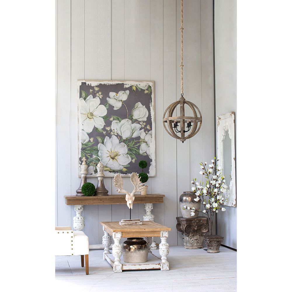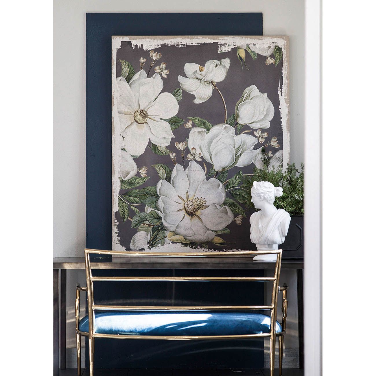 Featuring brilliant white flowers against a rich gray background, the Magnolia Blooms Canvas Print adds glamour and vintage style to your space. Transform a wall in your home with this stunningly detailed print. With its impressive size and opulent look, the Magnolia Blooms Print makes an elegant statement in a master bedroom, living room, or sunroom.