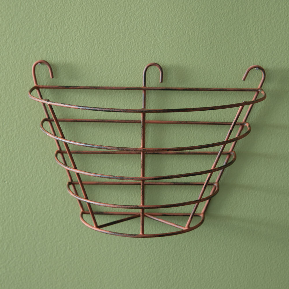 Keep things organized in any room of a farmhouse home with our Rustic Wire Hanging Basket. This basket is made of metal with a rustic finish. To hang, use its three screw hole hangers.